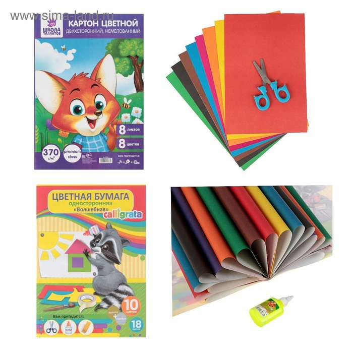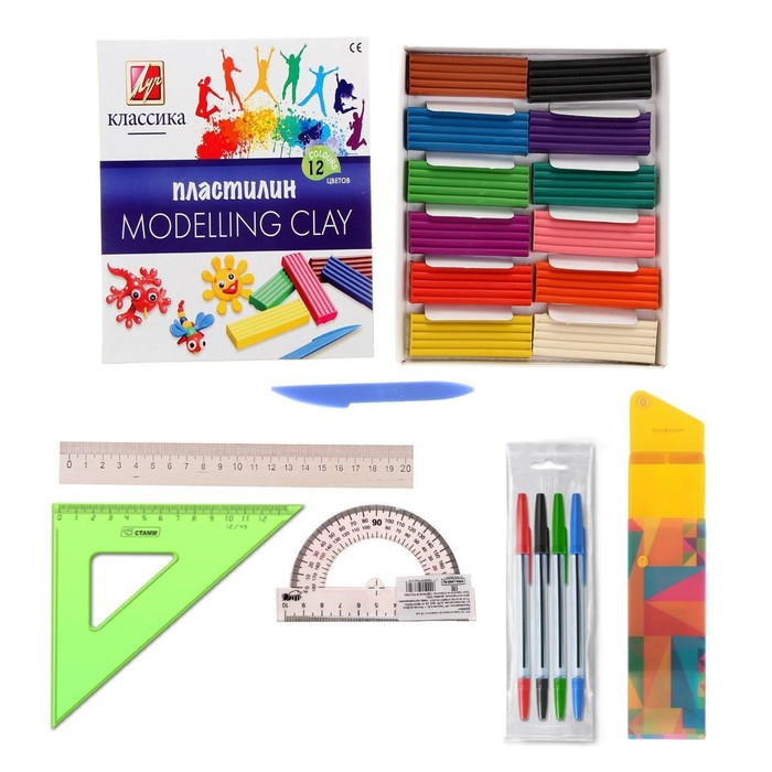 Альбом, Карандаши, Кисть, Ластик, Линейка, Ножницы, Пенал, Подстаканник, Ручка, Тетрадь, Точилка, Трафарет, Фломастеры, Цветная бумага, Цветной картон
