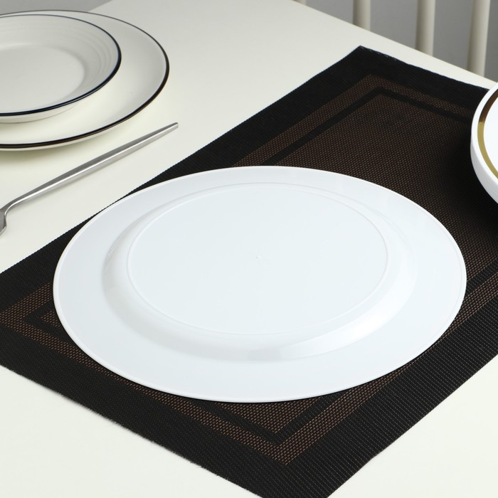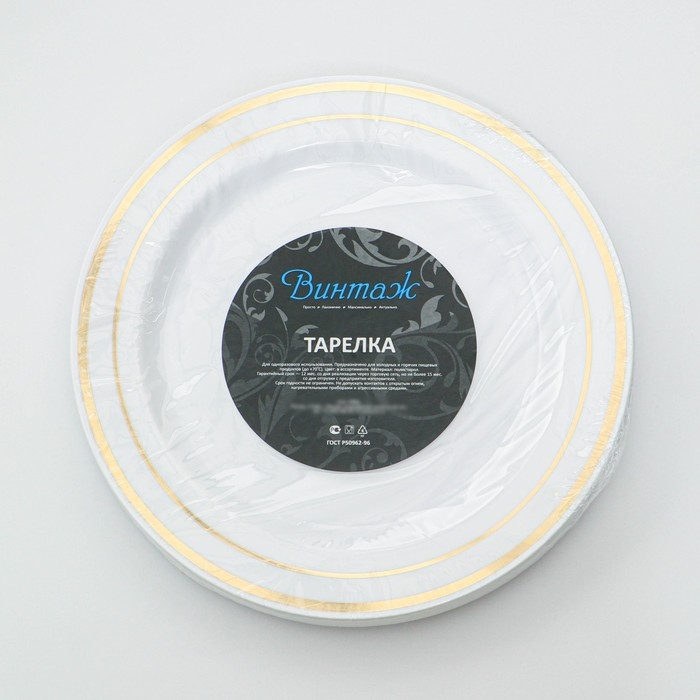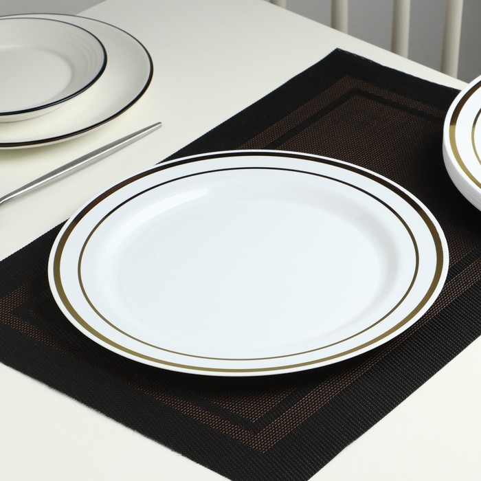 Тарелка пластиковая одноразовая, 23 см, круглая, плоская, цвет белый с золотой каёмкой
