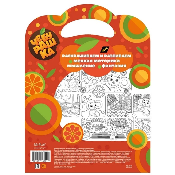Большая раскраска поможет ребёнку весело провести время одному или в компании друзей. Внутри изображения Чебурашки — любимого персонажа популярного мультфильма. Раскраска двусторонняя, внутри неё есть интересные задания.