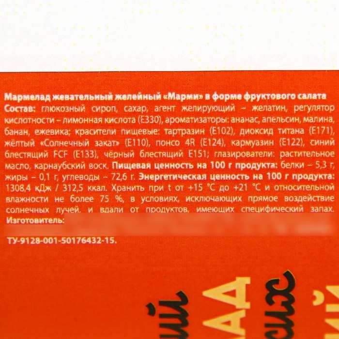 Состав: глюкозный сироп, сахар, агент желирующий - желатин, регулятор кислотности - лимонная кислота (Е330), ароматизатор: ананас, апельсин, малина, банан, ежевика; красители пищевые: татарзин (Е102), диоксид титана (Е171), желтый "Солнечный закат" (Е110), понсо 4R (E124), кармаузин (Е122), сний блестящий FCF (Е133), черный блестящий Е151; глазирователи: растительное масло, карнаубский воск.