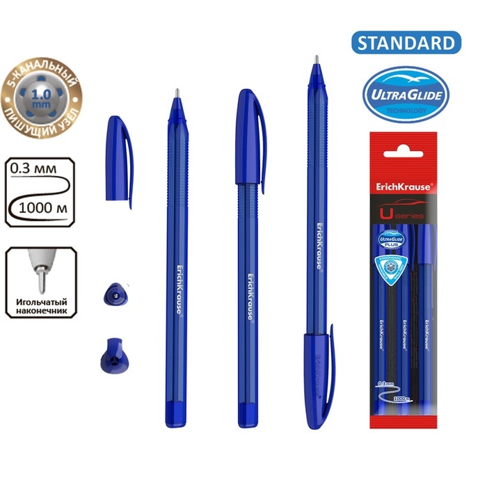 Набор ручек шариковых 3 штуки, ErichKrause U-108 Original Stick, игольчатый узел 1.0 мм, чернила синие, супермягкое письмо, корпус тонированный синий