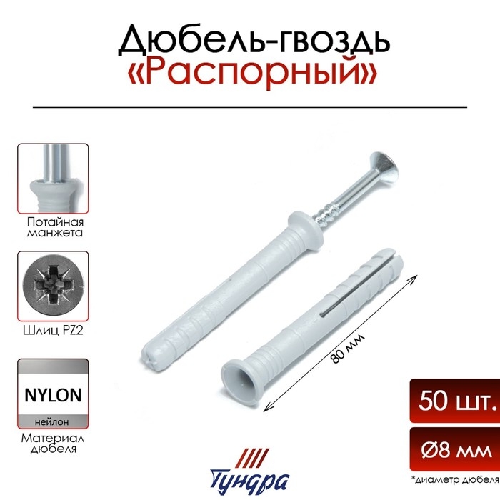 Дюбель-гвоздь "ТУНДРА", распорный, нейлоновый, потайная манжета, 8х80 мм, 50 шт