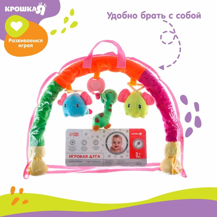 Эту дугу можно закрепить на детской кроватке, коляске или автокресле с помощью удобных прищепок. Угол наклона дуги регулируется. Сначала малыш будет просто рассматривать яркие игрушки, лежа на спинке, но со временем он обязательно начнет тянуться к ним ручками и ножками, совершенствуя свои двигательные навыки. Игрушки на дуге имеют различные цвета и формы, в том числе материал — специально для развития тактильных ощущений малышей. Изделие изготовлено из текстильных материалов с элементами пластмассы.