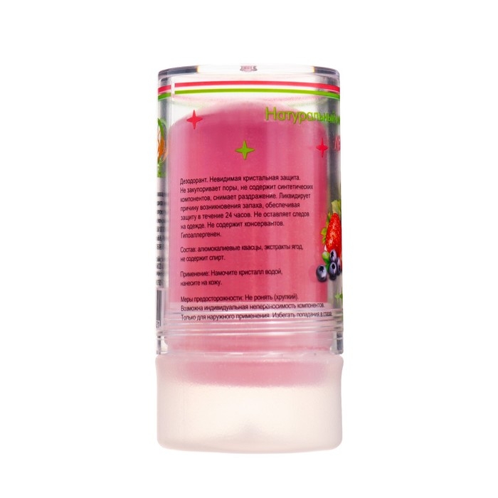 Состав: ammonium alum(аммониевые квасцы), экстракты ягод. Не содержит хлоргидрата алюминия, парабенов , фталатов и ароматизаторов. 100% натуральный продукт. Не оставляет пятен и белых следов.
