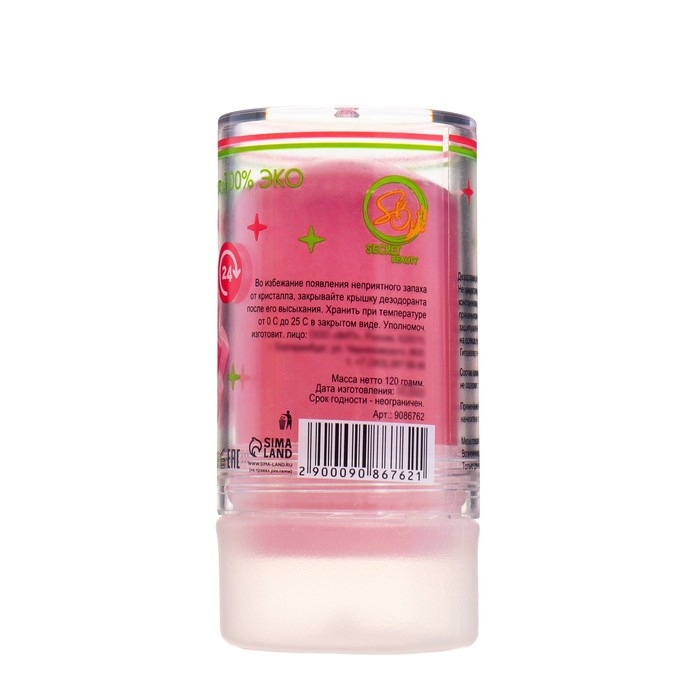 Свойства: абсолютно безвреден для организма, так как в отличие от многих современных дезодорантов не содержит хлоргидрат алюминия и прочие вредные химические субстанции. В нем отсутствуют эмульгаторы, закупоривающие поры и потовые протоки, нарушающие функцию потовых желез. Не содержит спирта, не вызывает раздражения или аллергии. В его состав не входят масла, оставляющие пятна на одежде. Единственный безвредный дезодорант, разрешенный к применению беременным и кормящим женщинам.