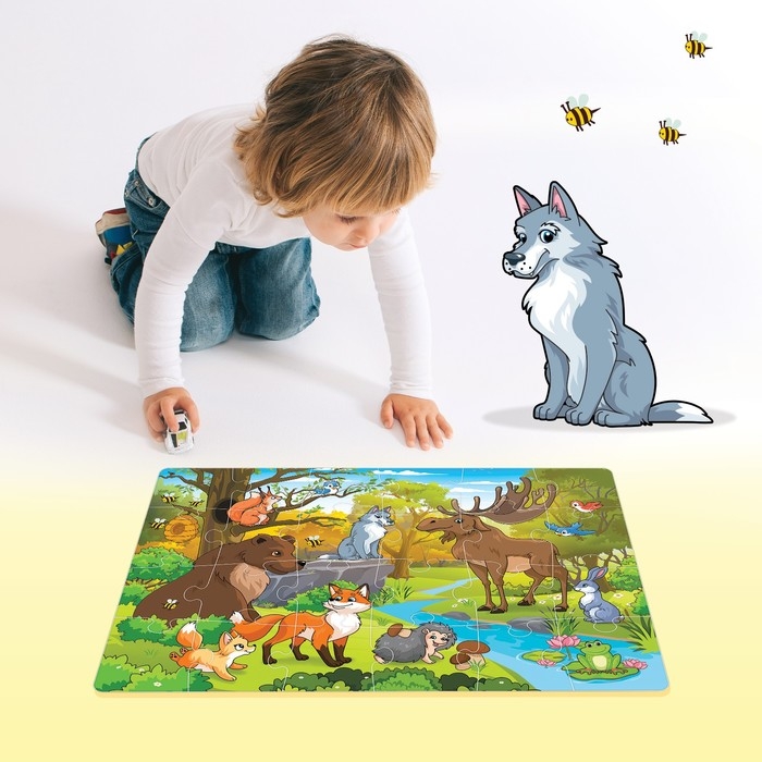 Напольный пазл разработан специально для малышей. Крупные элементы и красочные иллюстрации заинтересуют малыша.