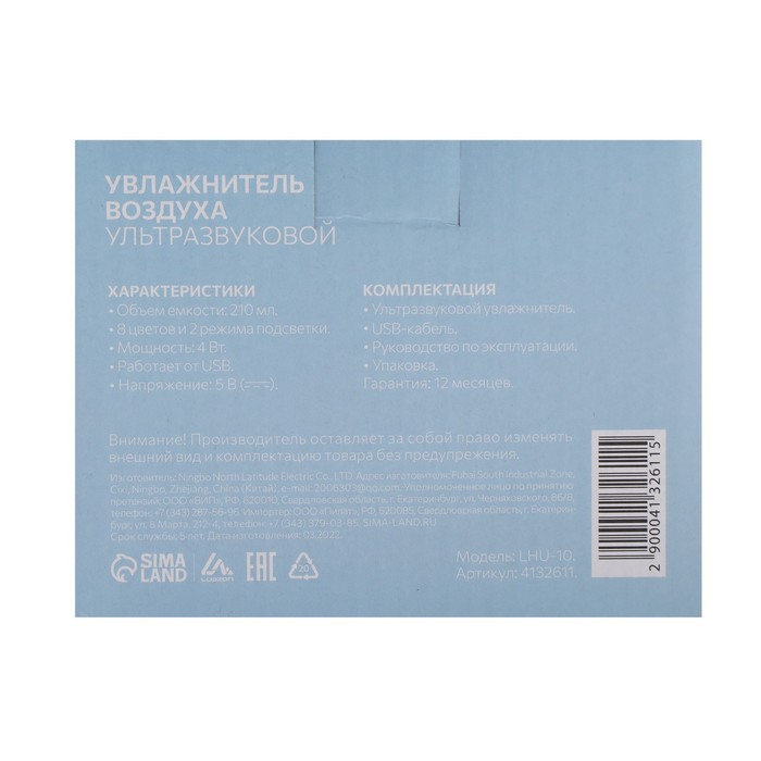 Увлажнитель воздуха Luazon LHU-10, ультразвуковой, 210 мл, 2 режима, подсветка