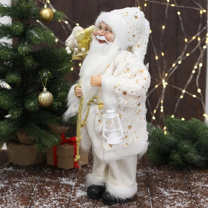 Дед Мороз "В белой звёздной шубке, с фонарём" 45 см