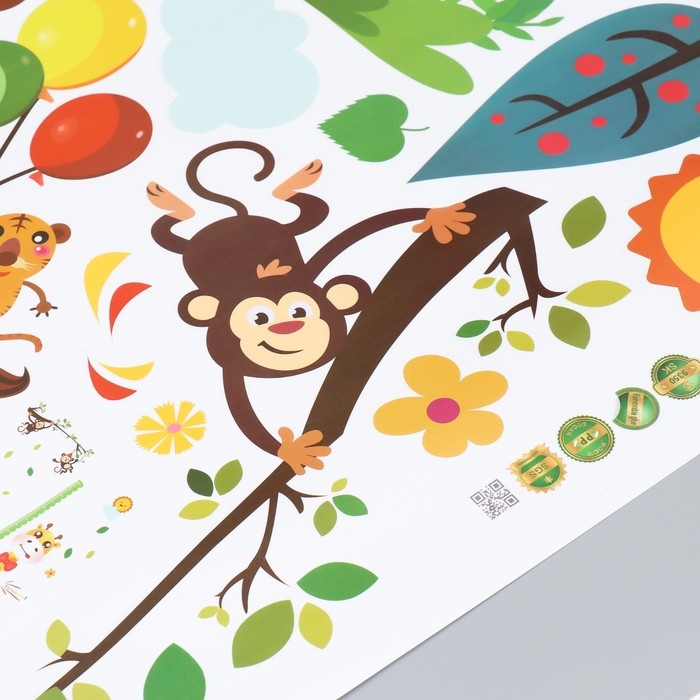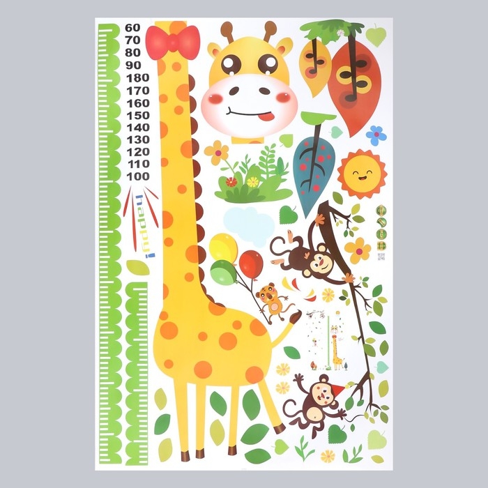 Наклейка пластик интерьерная цветная ростомер "Жираф и мартышки" 60х90 см