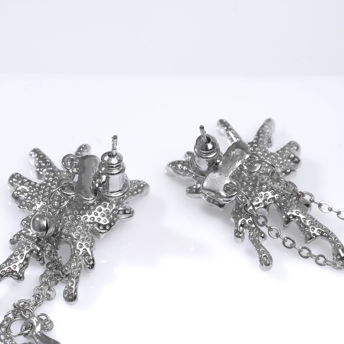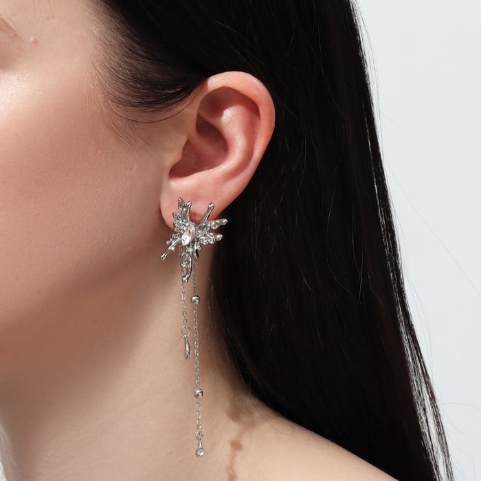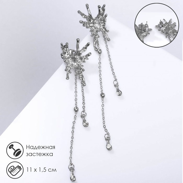 Серьги висячие со стразами «Жар-птица» капли и бусины на цепочке, цвет белый в серебре, 11 см
