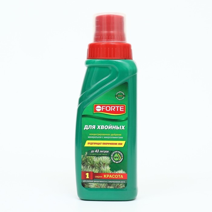 Жидкое водорастворимое минеральное удобрение для хвойных Bona Forte 285 мл используется для усиления декоративности и стимуляции роста елей, сосен, туи, пихты, можжевельника, кедра, кипариса, тиса, лиственницы.