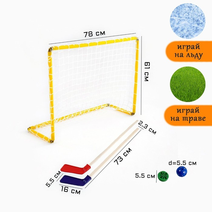 Хоккейный набор 3 в 1, 2 клюшки 73 см, ворота 4 штуки, 2 мяча d-5.5 см, клин 8 штук