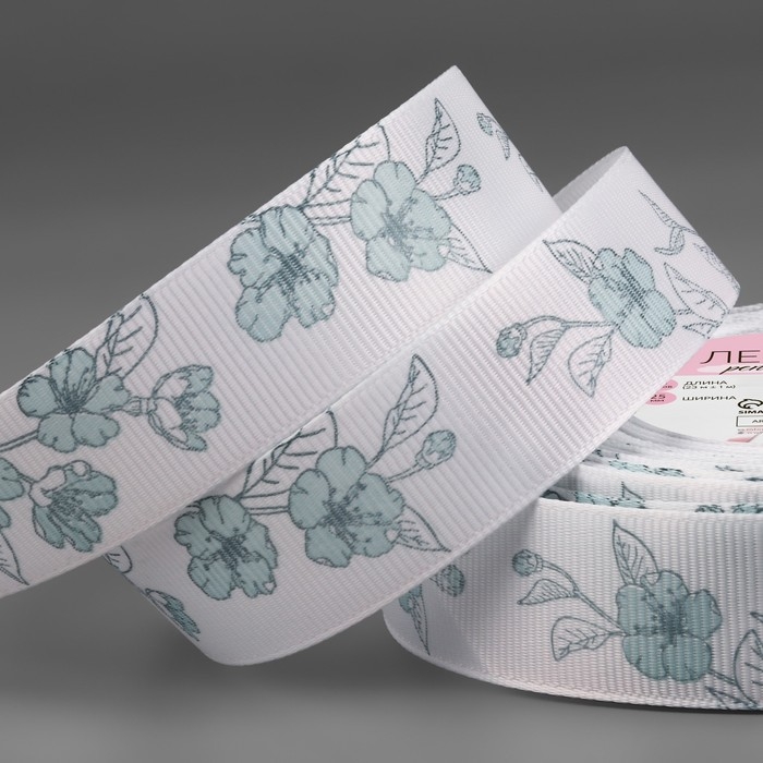 Лента репсовая «Цветы», 25 мм, 23 ± 1 м, цвет белый/голубой