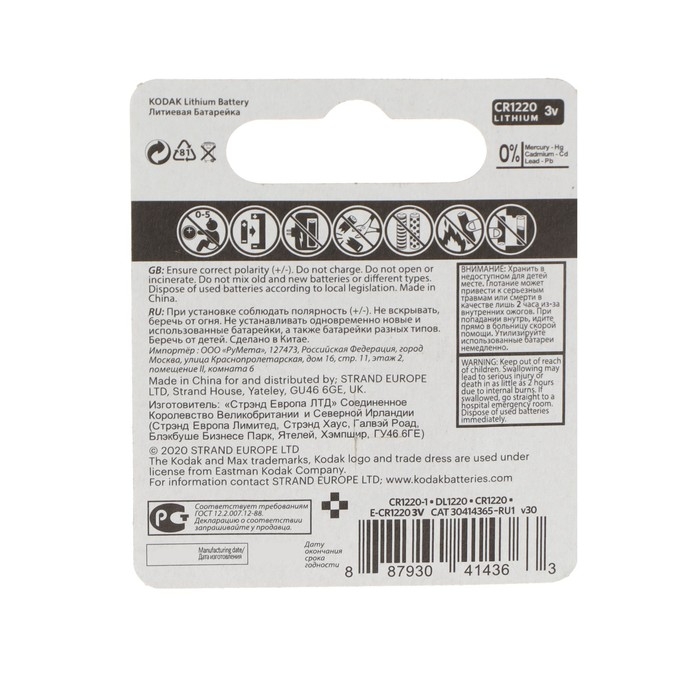 Батарейка литиевая Kodak Max, CR1220-1BL, 3В, блистер, 1 шт.