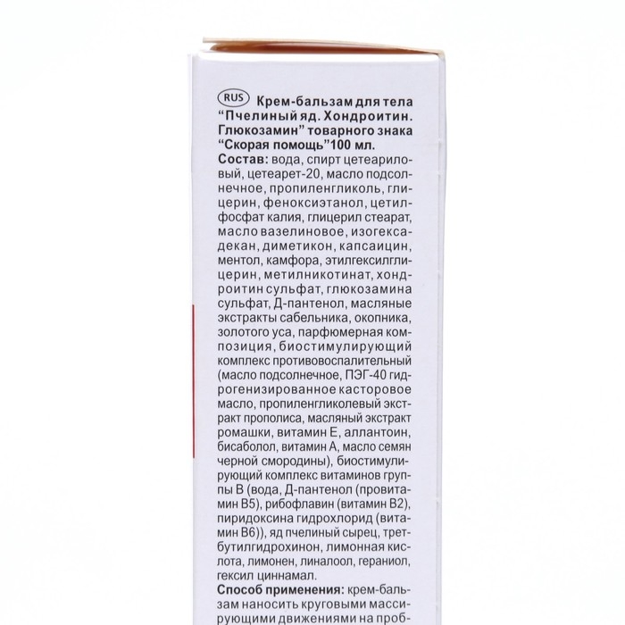 Состав: вода, спирт цетеариловый, цетеарет-20, масло подсолнечное, пропиленгликоль, глицерин, феноксиэтанол, цетилфосфат калия, глицерил стеарат, масло вазелиновое, изогексадекан, диметикон, капсаицин, ментол, камфора, этилгексилглицерин, метилникотинат, хондроитин сульфат, глюкозамина сульфат, Д-пантенол, масляные экстракты сабельника, окопника, золотого уса, парфюмерная композиция, рибофлавин, пиридоксина гидрохлорид, яд пчелиный сырец, трет-бутилгидрохинон, лимонная кислота, лимонен, линалоол, гераниол, гексил циннамал.
