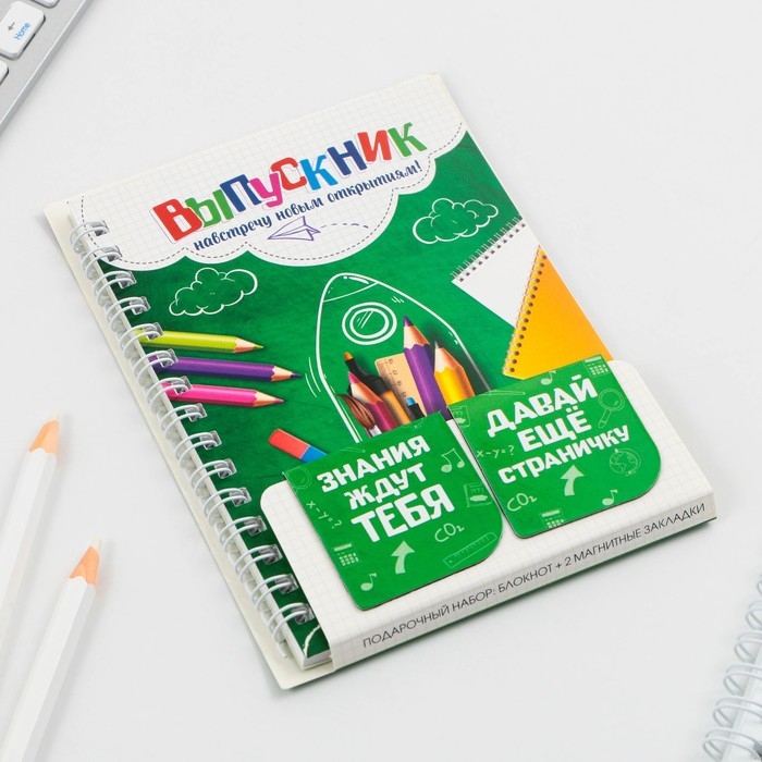 Подарочный набор на выпускной «Навстречу новым открытиям!»: блокнот А6 60 л., магнитные закладки 2 шт.