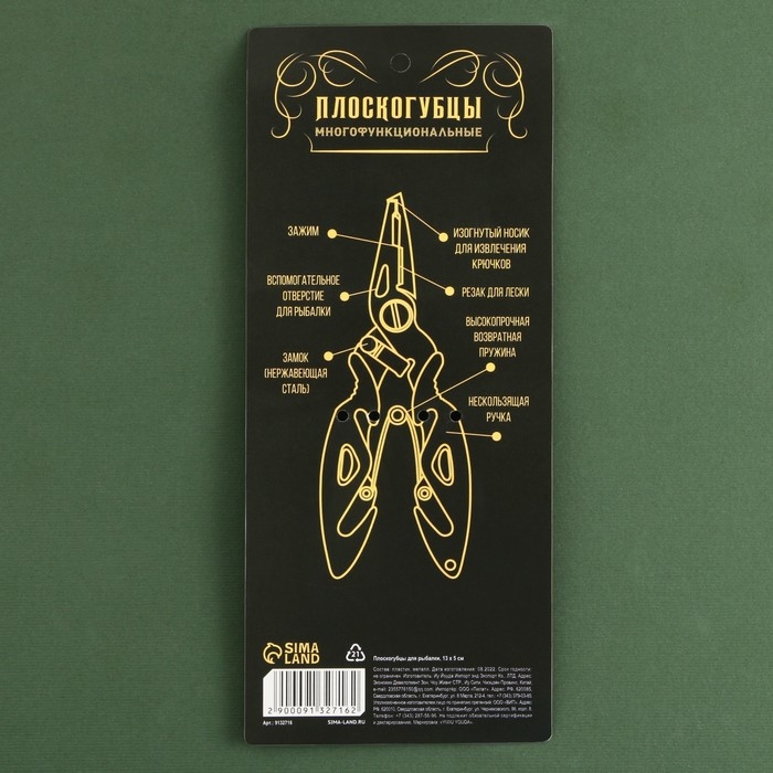 Плоскогубцы рыбака предназначены для обрезания плетеного шнура, монопольной и флюорокарбоновой лески. Так же можно отрезать стальные и титановые поводки. Затягивать рыболовные узлы, загибать разогнувшиеся офсетники, двойники и тройники. На рыбалке удобны при монтаже оснасток или вязании поводков. Так же удобно вынимать приманки из пойманной рыбы. Рыболовные плоскогубцы, позволят вам зажимать грузила и разгибать заводные кольца для блесен, воблеров и джиг головок, зажимать обжимные трубочки для стальных и флюорокарбоновых поводков. Этот мультитул имеет удобную рукоятку и механизм фиксации. Также, благодаря подарочной упаковке, их можно преподнести в качестве дополнения к подарку настоящему рыбаку!