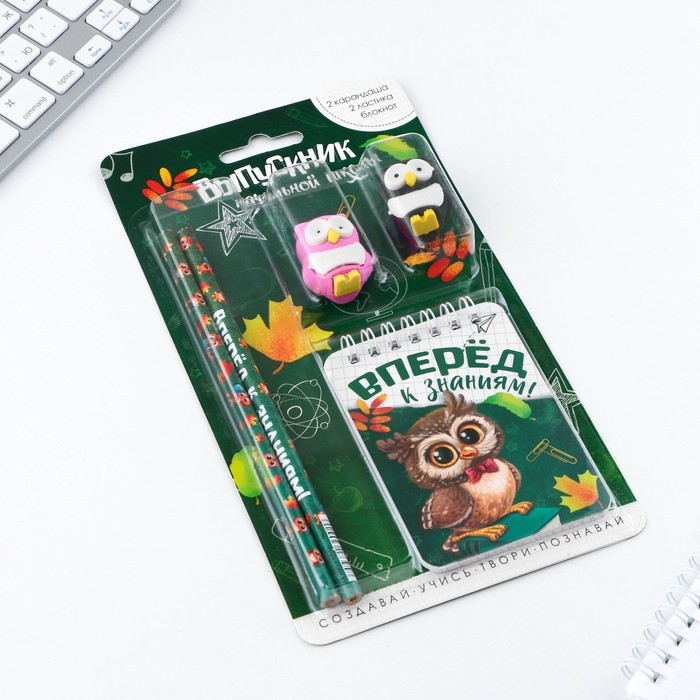 Подарочный набор на выпускной «Вперёд к знаниям!» ластики 2 шт, карандаши HB 2 шт, блокнот А7