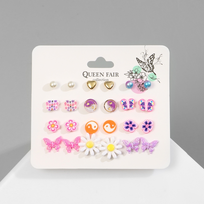 Пусеты 9 пар «Юность» бабочки и жемчужины, цвет белый в золоте