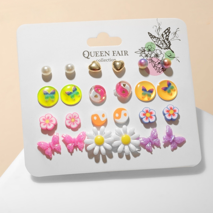 Набор серьги 12 пар «Бабочки» и цветочки, цветные в золоте