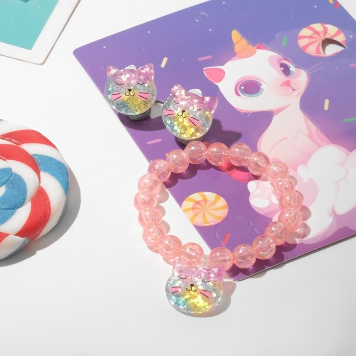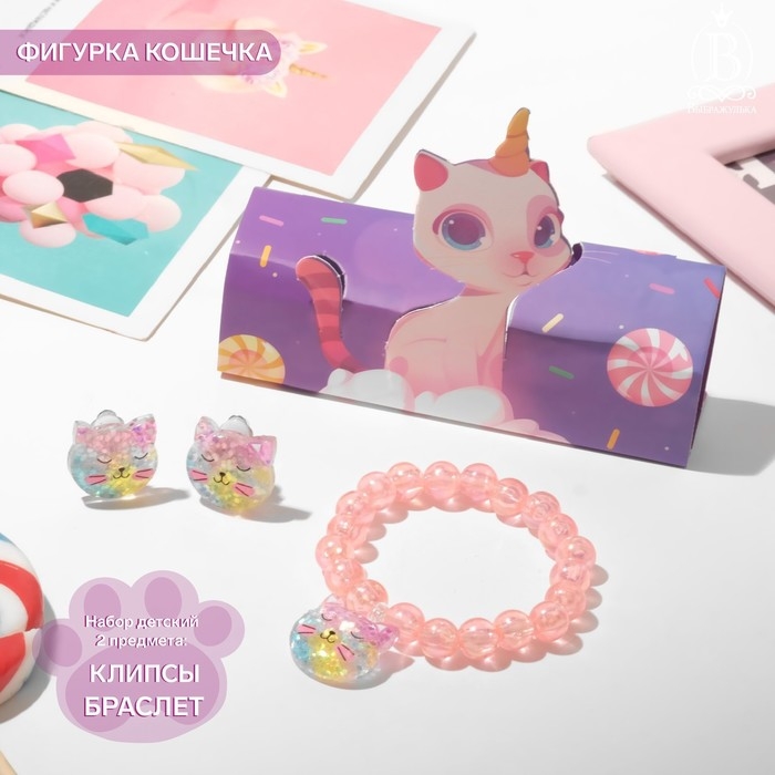 Набор детский «Выбражулька» 2 предмета: клипсы, браслет, фигурка кошечка, цветной