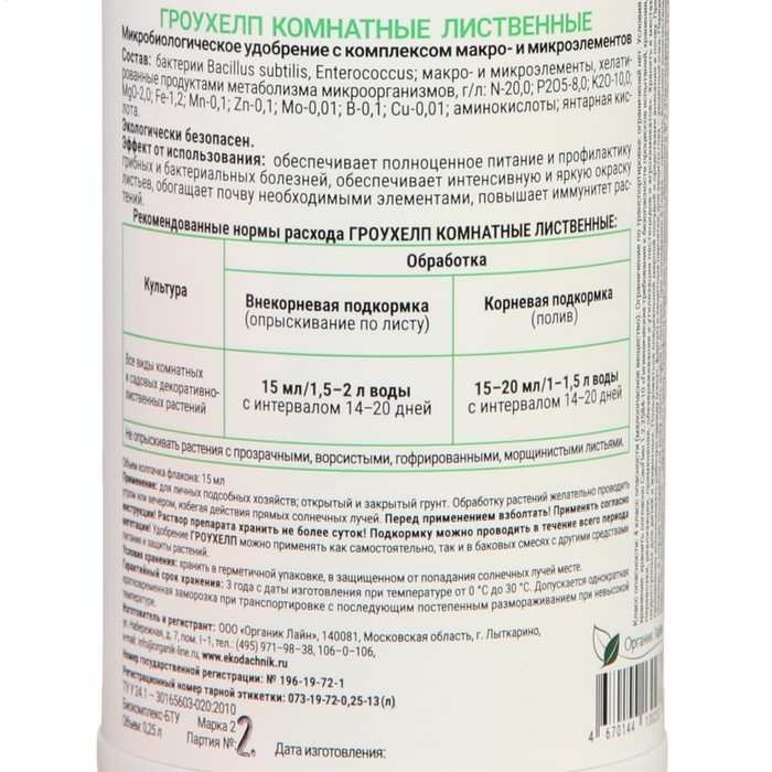 Удобрение жидкое ГРОУХЕЛП для лиственных, 250 мл