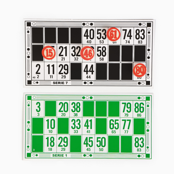 Представляем классическую версию популярной настольной игры. Перед началом партии необходимо сложить в специальный мешочек все бочонки с номерами. Ведущий должен не глядя по очереди доставать их и объявлять число, а участники — закрывать соответствующие поля на карточках. Побеждает тот, кто заполнит свою карточку первым.