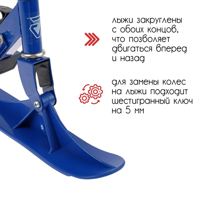 Самокат-снегокат актуален зимой и летом. На колёсах можно кататься по любым ровным поверхностям в сухое время года, зимой — на лыжах по снегу.