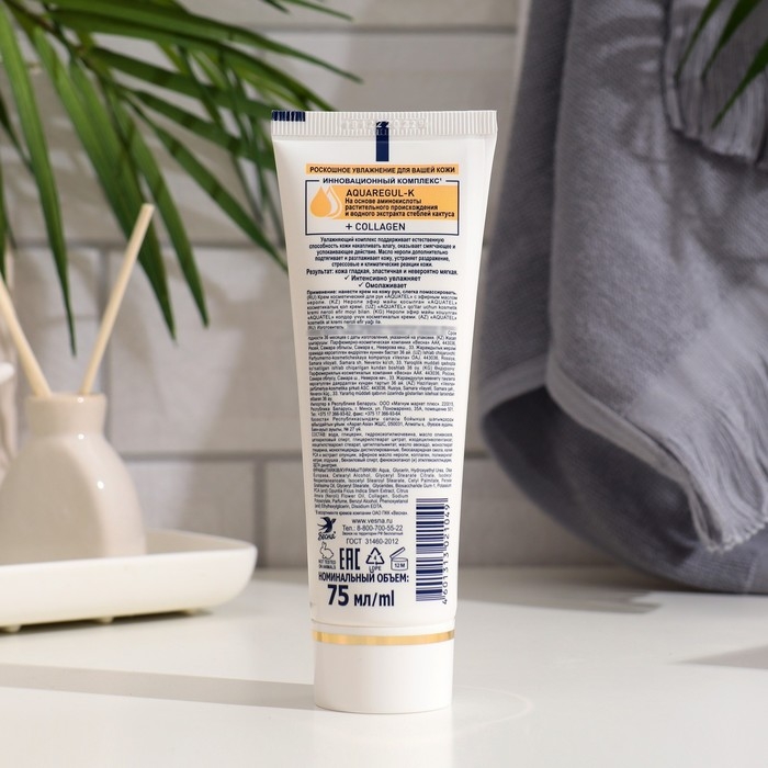 Состав: вода, глицерин, гидроксиэтилмочевина, масло нероли цетеариловый спирт, глицерилстеаратцитрат, изодецилнеопентаноат, изоцетилстеароил стеарат, цетилпальмитат, масло ши, моностеарат глицерина, моноглицериды дистиллированные, биосахаридная смола, калия РСА и экстракт опунции, коллаген, полиакрилат натрия, парфюмерная композиция, бензиловый спирт, феноксиэтанол и этилгексилглицерин, ЭДТА динатрия.