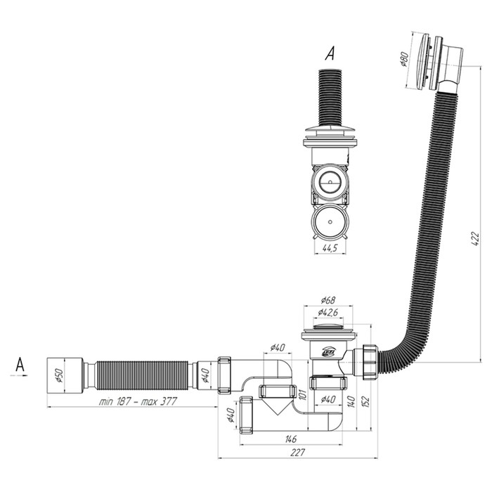 Сифон для ванны "АНИ Пласт" Варяг С6250, регулируемый, 1 1/2" x 40, с выпуском и переливом