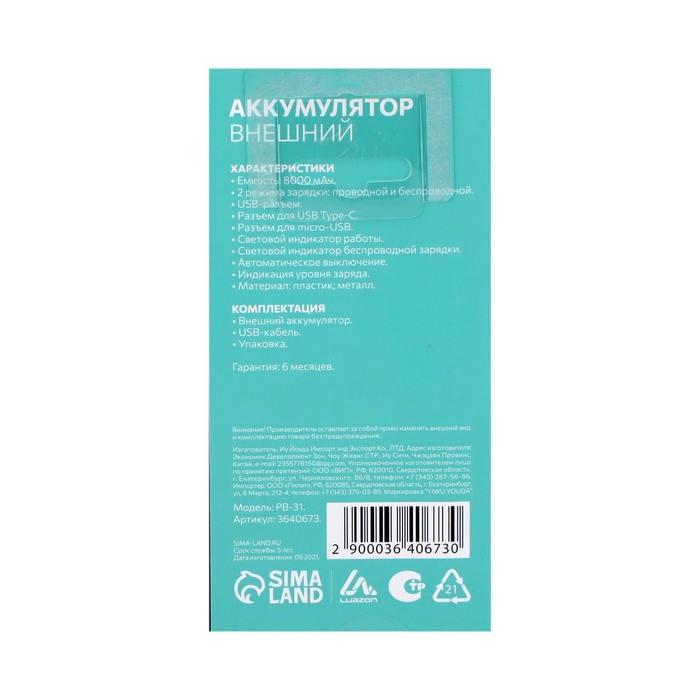 Внешний аккумулятор Luazon модель PB-31, 8000 мАч, USB, microUSB-Type-C, беспр.заряд. черный