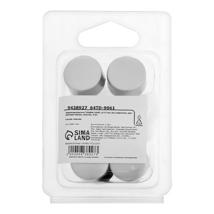 Зеркалодержатель ТУНДРА LIGHT, d=17 мм, без сверления, цвет матовый никель, пластик, 4 шт.