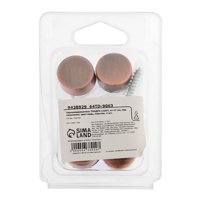 Зеркалодержатель ТУНДРА LIGHT, d=17 мм, без сверления, цвет медь, пластик, 4 шт.