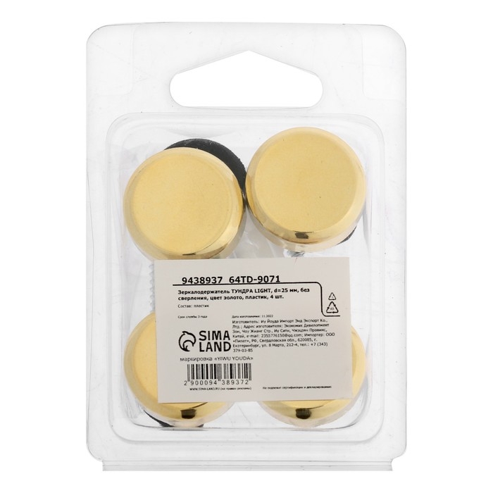 Зеркалодержатель ТУНДРА , d=25 мм, без сверления, цвет золото, пластик, 4 шт.