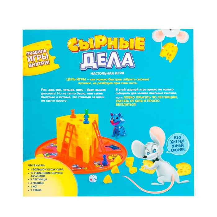 Настольная игра-бродилка «Сырные дела»: кубик, фишки-мышки, кот, сырные кусочки, 2-4 игрока, 3+