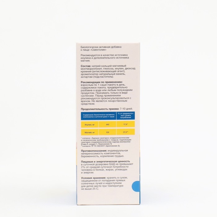 Состав: Натрий-кальций-магниевый монтмориллонит, глюкоза, инулин, диоксид кремния (антислеживающий агент), ароматизатор натуральный ваниль, аспартам (подсластитель).