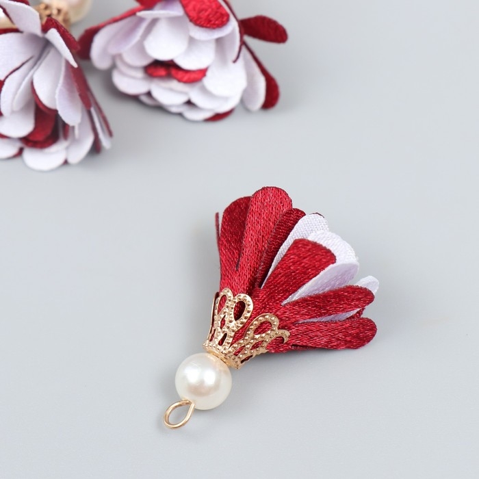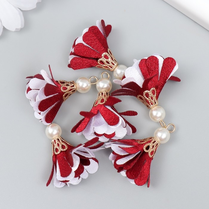 Декор текстиль "Цветок 2 цвета с жемчужиной. Бордовый и белый" набор 6 шт 3 см