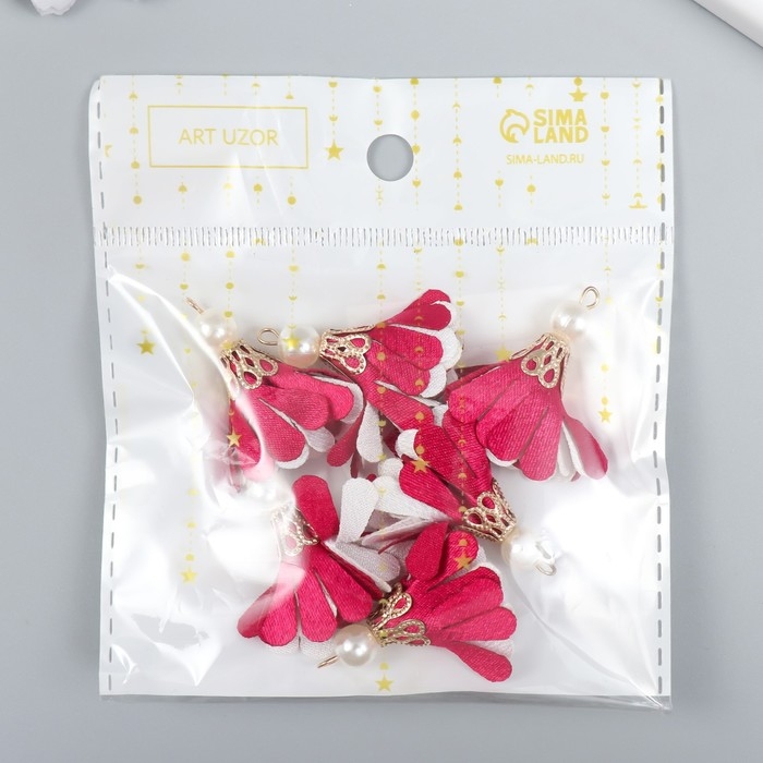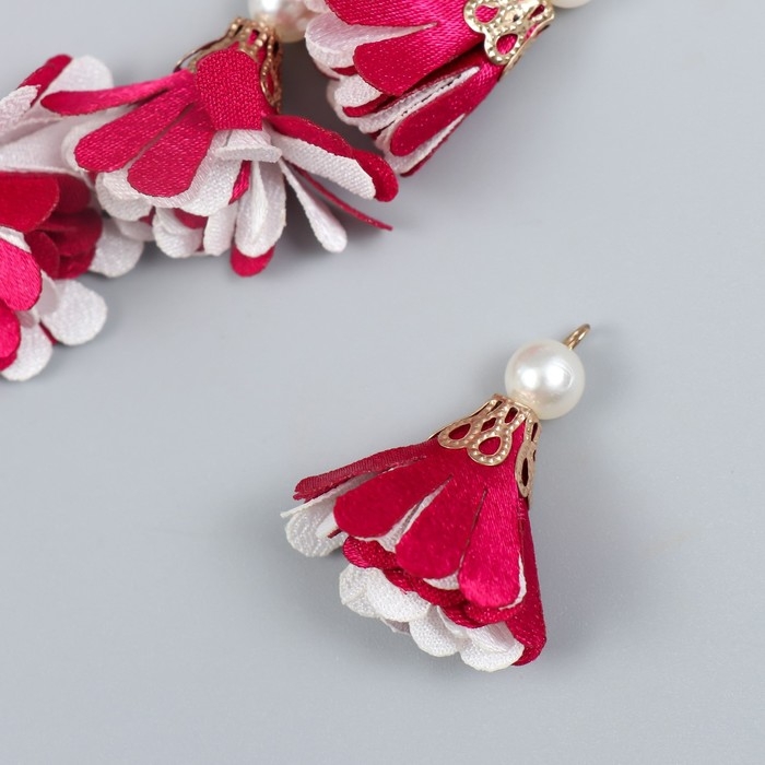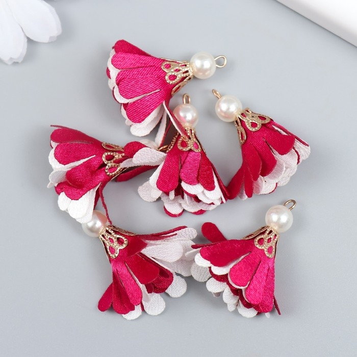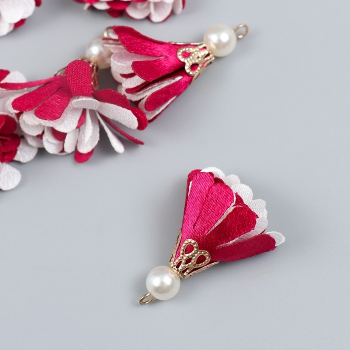 Декор текстиль "Цветок 2 цвета с жемчужиной. Малиновый и белый" набор 6 шт 3 см
