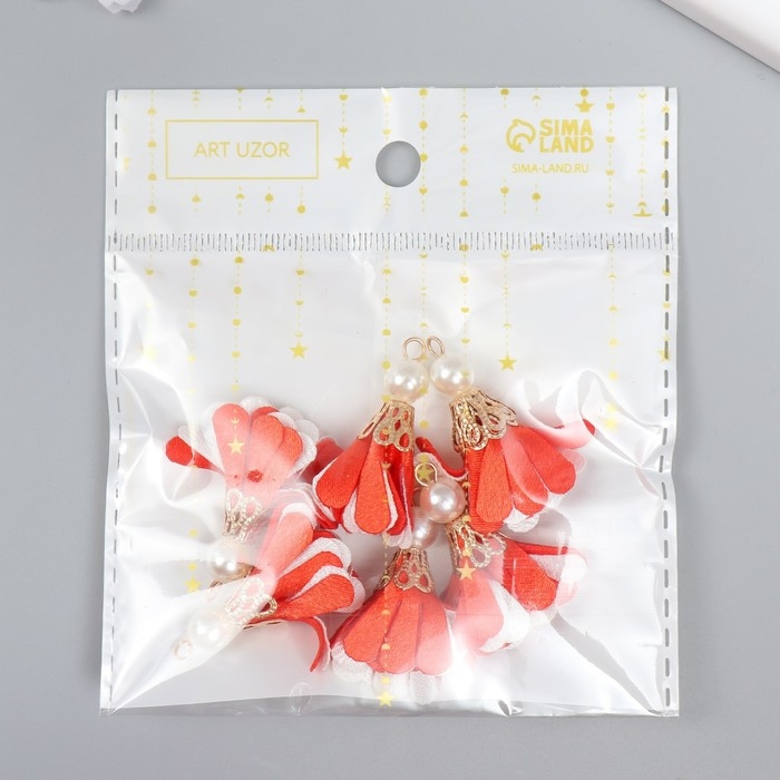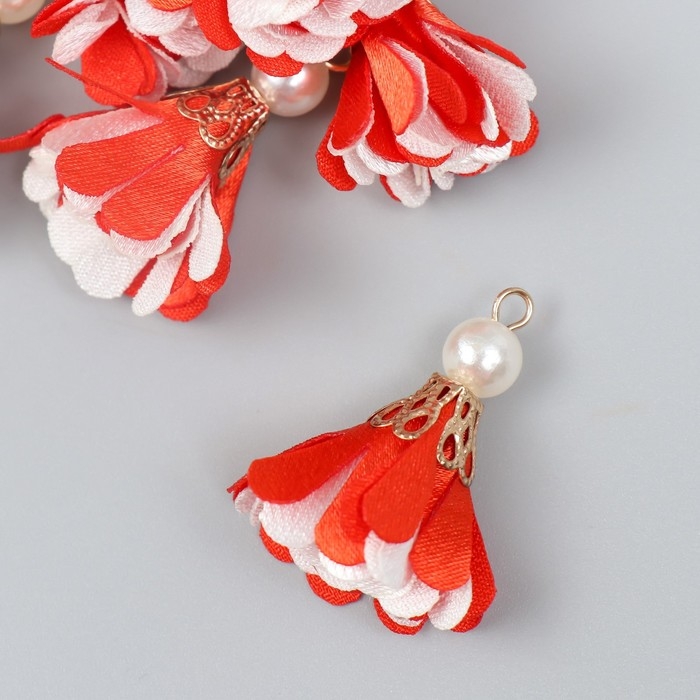 Декор текстиль "Цветок 2 цвета с жемчужиной. Красный и белый" набор 6 шт 3 см