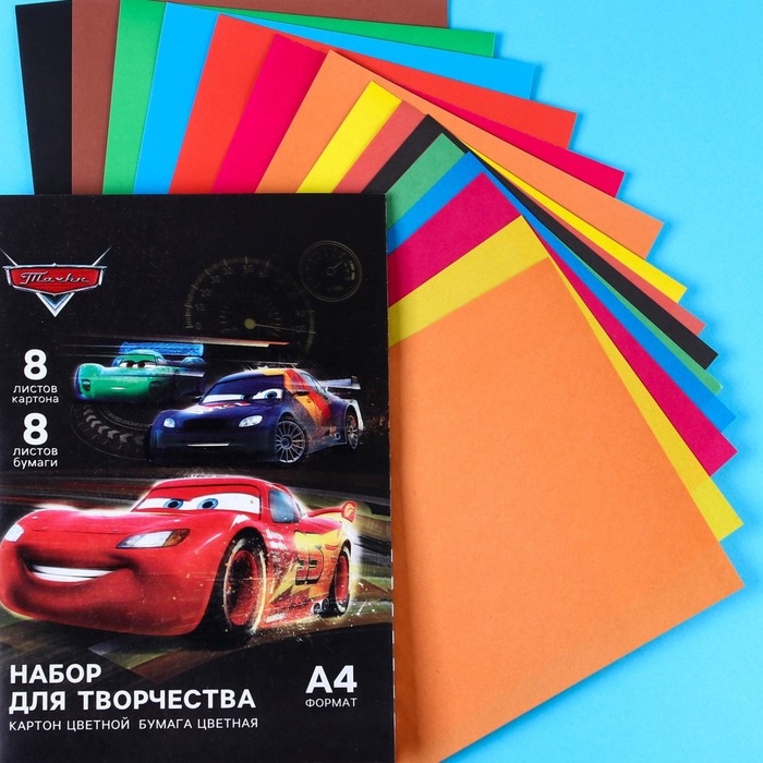 Набор «Тачки» А4: 8 л. цв. одност. мел. картона и 8 л. цв. двуст. бумаги, Тачки