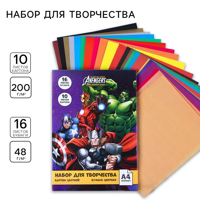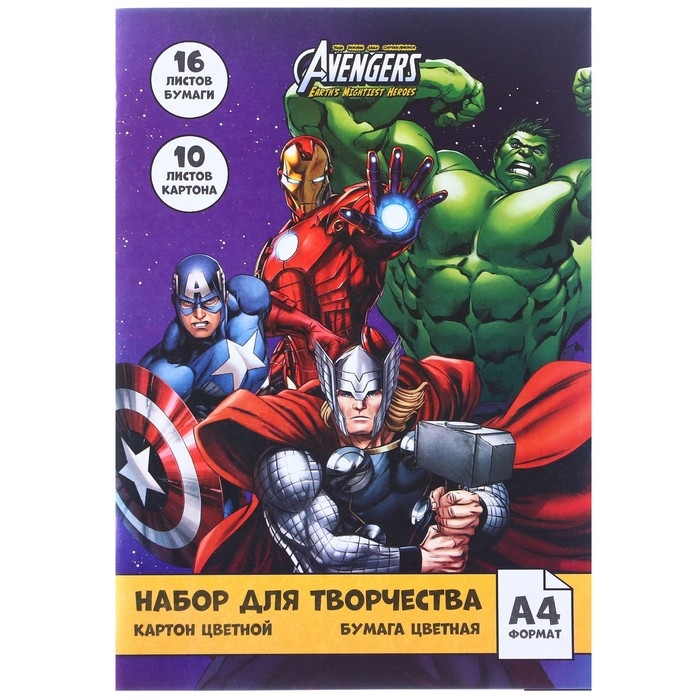Набор «Команда» А4: 10 л. цв. одност. мел. картона и 16 л. цв. двуст. бумаги, Мстители