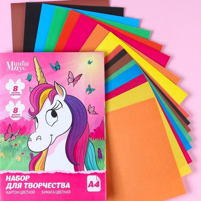 Набор «Единорог» А4: 8 л. цв. одност. мел. картона и 8 л. цв. двуст. бумаги,Минни Маус