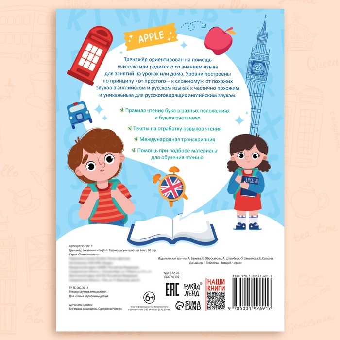 Тренажёр поможет ребёнку закрепить навыки чтения и произношения английских букв, буквосочетаний и слов. Книга ориентирована для занятий с учителем или другим взрослым, который знает английский язык. Уровни построены по принципу от простого — к сложному: от похожих звуков в английском и русском языках к частично похожим и уникальным для русскоговорящих английским звукам.