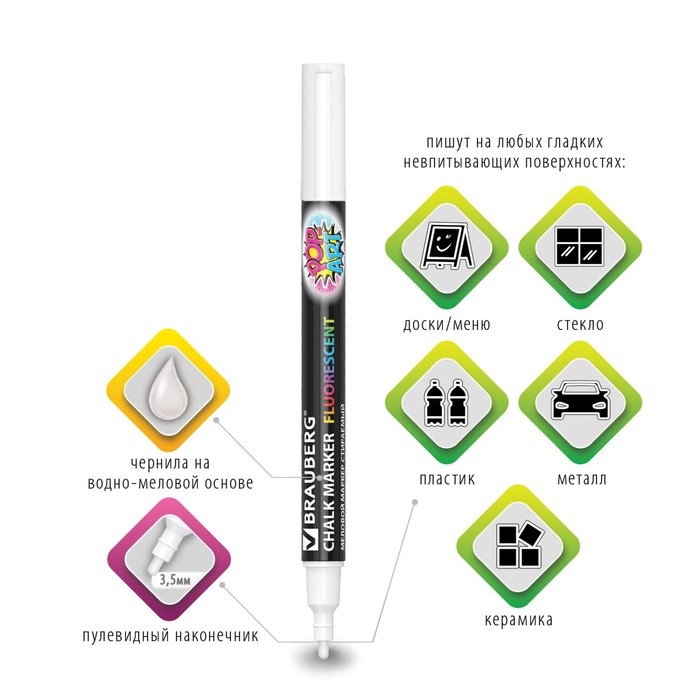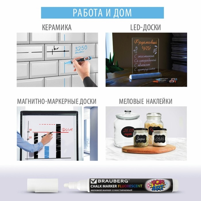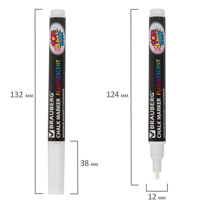 Маркер меловой BRAUBERG "POP-ART" предназначен для использования на гладких поверхностях (стекло, доски) . Этот маркер обладает стираемыми чернилами, что позволяет легко удалять запись с поверхности.