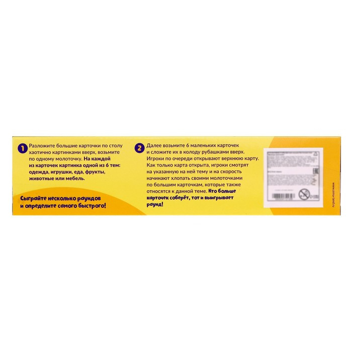 Разложите большие карточки на столе картинками вверх, возьмите по одному молоточку. На каждой из карточек есть картинка одной из 6 тем: одежда, игрушки, еда, фрукты, животные или мебель.