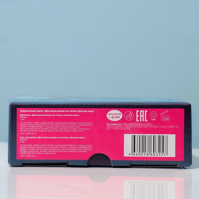 Подарочный набор Для мальчиков (гель для душа 200мл, шампунь 200мл) Нежная формула шампуня очищает и ухаживает за волосами, а экстракты ромашки, календулы и шиповника сохраняют их здоровый вид и блеск. Нанести шампунь на влажные волосы, вспенить массирующими движениями и тщательно смыть водой. Для детей от 6 лет. Не глотать! В случае попадания в глаза обильно промыть водой. В случае возникновения индивидуальной реакции прекратить применение.