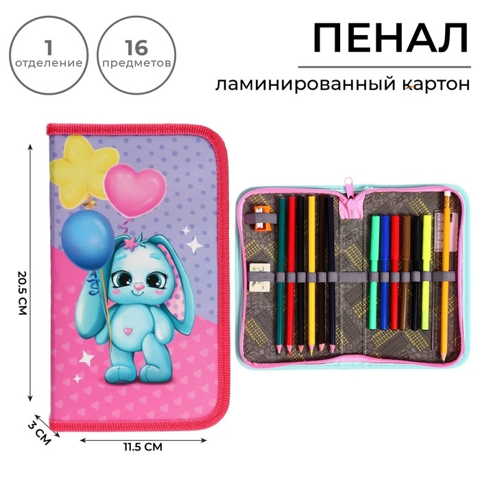 Пенал 1 секция, 115 х 205 мм, с наполнением 16 предметов, Calligrata "Зайка" ламинированный картон, 30П26/set