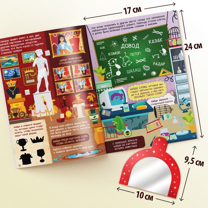 - Внутри книги есть зеркальце размером 10 × 9,5 см и кармашек для его хранения.