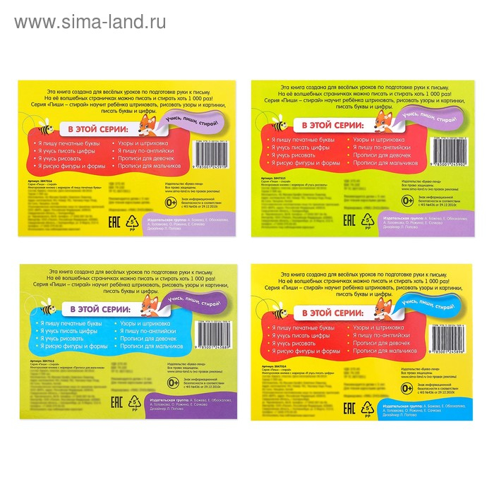 Особенность изданий: глянцевые страницы. С них без труда можно стереть маркер. Именно поэтому заниматься с книжкой можно не один раз.