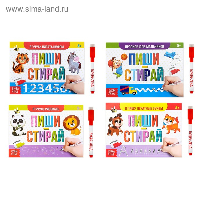 Набор многоразовых прописей с маркером «Обучающий», для мальчиков 4 шт. по 12 стр.